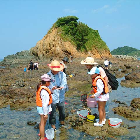 手つかずの自然で大潮の日に特別許可をもらい磯遊び体験を開催しています。特別な条件で磯遊びを体験することができます。